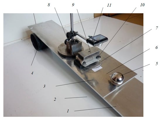 The principle scheme of the experimental device presented in Figure 1 is detailed in Figure 9. Since the pure rolling condition is fulfilled, between the precession angle ψ and the intrinsic rotation angle φ, a relation exists (Equation (19)), and the position of the pendulum will be completely described by any of the two parameters. From an experimental point of view, the precession angle is more convenient to be measured (between the fixed axis x1 and mobile axis x2) while the intrinsic rotation angle is measured between two mobile axes (x3 and x′). From Figure 9, it is noticed that the axes x1 and x2 are normal to the axis z1 ≡ z2. The same ψ angle is formed by the two planes made by the axis z1 ≡ z2 and the axis x1 and x2, respectively; see Figure 9. The ball, 5, oscillates on the plate to be tested, 3; a rubber plate, 8, is positioned with the edge to the center of the fulcrum, O. A rectangular prismatic steel body, 9, is positioned on top of the rubber plate. A protractor, 7, is attached to the body, 9, by means of two magnets, 10. The magnets permit positioning the protractor, 7, both in the plane parallel to the plate, 3, and on the normal direction to the plate, for a minimum distance from the wire, 6, and for obtaining the actual size of the ψ angle. The oscillations of the wire are filmed with a camera, 11. The actual device is shown in Figure 10.