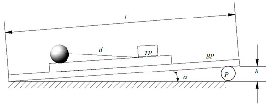 - The tilting angle of the device to the imposed angle α is obtained by moving the adjusting cylinder, 5 (the cylinder is moved until the short mobile edge of the plate, 1, reaches the height h = l∙sinα);