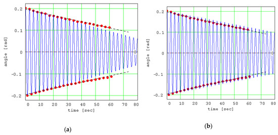 From Figure 15, it can be observed that the amplitude of the theoretical signal decreases linearly with time, and this tendency is supported by the experimental data. Dzhiladvari [16] found the same dependency for the final stage of oscillations. On the same plot, there were represented the two regression lines that interpolate the experimental data. These lines are also the envelopes of the theoretical signal. In Figure 15, the theoretical signal is shown for the coefficient of rolling friction sr = 3.2∙10−6 m. It should be mentioned that the method is strongly dependent on the coefficient sr, as seen in Figure 16, where the values were modified in addition and subtraction with small quantities and the plots (blue) detach from the regression lines (black dash).