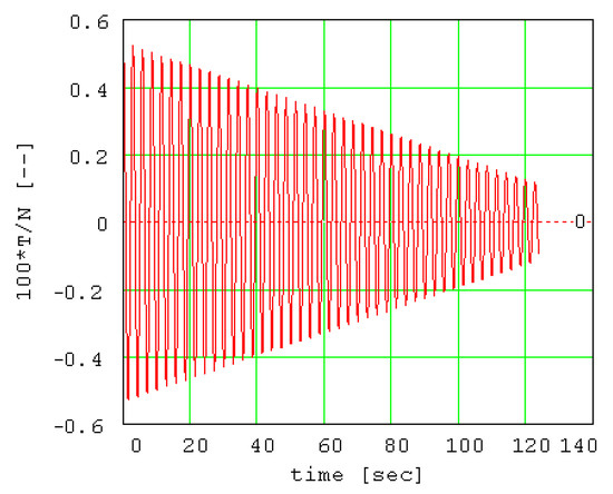 The variation of the normal force is presented in Figure 17 and the extreme and mean values are also given. The normal force can be considered approximately constant because it was demonstrated that the maximum variation of the normal force during the oscillation process is 0.054% from the medium value. From Equation (28), it results that the rolling friction torque will have a similar behavior, regardless of the value of the β exponent. The ratio between the friction force and the normal force T/N is represented in Figure 18 in order to estimate the validity of the pure rolling condition, expressed by Equation (34). From the plot, it is remarked that the values of the ratio are one hundred times smaller than the values of the coefficient of sliding friction. This is an important feature of the conical pendulum compared to the planar pendula, [17,18] for which, for amplitude values greater than 15°..20°, the sliding friction replaces the rolling friction.