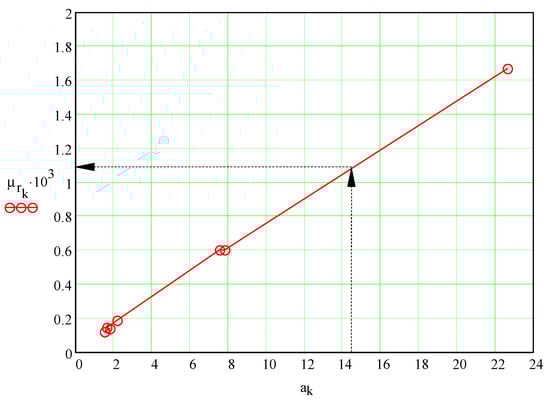 Figure 19 presents the dependency of the coefficient of rolling friction μr on the modulus of the slope a of the straight line enveloping the theoretical signal. The plot shows the proportionality between parameters. This result substantially simplifies the methodology of finding the coefficient of rolling friction: practically, for the same test device geometrical parameters (inclination of the plate, ball radius, pendulum length), two points are sufficient for representing the plot. For a material to be tested, the experimental data obtained from oscillations of the pendulum (the slope of the regression line of angular amplitudes) together with the μr(a) plot permit us to obtain the value of the rolling friction coefficient. This direct methodology avoids the guess steps used in integration of the dynamic Equation (33).