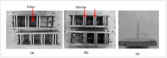 - The specimens were removed from the mold approximately 24h after casting (Figure 3c) and cured in a conditioning chamber with a temperature of 20 ± 3 °C and relative humidity of 95 ± 5% for 28 days. All the work scopes (test factors, their differences, and number of specimens) for the fiber pull-out tests are summarized in Table 1.