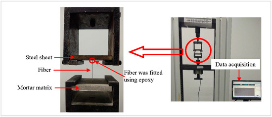 The pull-out test was conducted on a computer-controlled universal testing machine with a special designed metallic frame for loading, as depicted in Figure 4. First, the free end of the fiber in the specimen was threaded through the round hole of the steel sheets and then secured on the end using the epoxy to keep the fiber from slipping back through. Test was conducted based on protocol established in [22,24], and controlled by the position of the actuator, which had a displacement rate of 1 mm/min. The displacement and force during the test can be recorded by a data acquisition system, as shown in Figure 4. The compressive strength and the splitting tensile strength of mortar and concrete specimens were determined by a 3000-kN-capacity pressure testing machine.