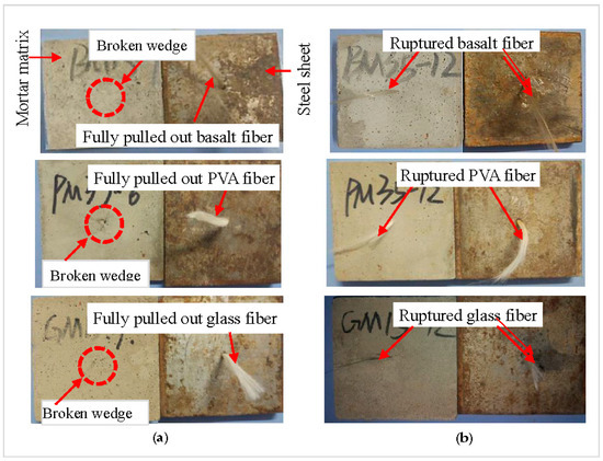 Figure 7 presents two typical failure modes of fiber pull-out: the fiber with complete pull-out from mortar (Figure 7a) and the ruptured fiber (Figure 7b). Clearly, the basalt, PVA, and glass fiber in Figure 7a are fully pulled out from the mortar, accompanied by a photo of the broken mortar wedge (particularly for the PVA fiber) occurred during the test. Figure 7b depicts the ruptured basalt, PVA, and glass fiber, one part of which embedded in mortar, and another is in steel sheets.