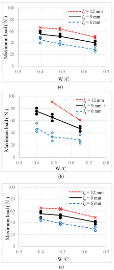 Furthermore, all maximum loads present a significant decrease with an increase in the W/C value of mortar matrix. For example, when the value of W/C increases from 0.40 to 0.49 for specimen with a fiber embedment length equal to 9 mm, the maximum load of basalt, PVA, and glass fiber decreases by 4.9%, 13.5%, and 6.7%, respectively. When the value of W/C increases from 0.40 to 0.65 for the 9 mm fiber, the maximum load of basalt, PVA, and glass fiber decreases by 25.8%, 38.0%, and 27.0%, respectively. This is in agreement with other results reported previously in [17,23,29]. This pronounced decrease may be caused by the stronger bond between fiber and stronger mortar when the W/C value increased from 0.40 to 0.65.