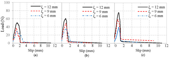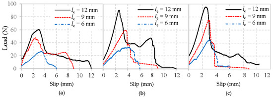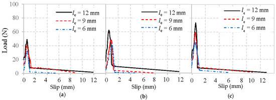 Obviously, all typical load–slip curves of fiber in Figure 9, Figure 10 and Figure 11 are characterized by a rapid increase of load until the maximum load is reached, followed by a drop as the fiber is debonded. After this, only frictional resistance remains until the fiber fully pulls out of the mortar matrix. The representative values of the pullout load can be identified as the initial load that represents where the fiber debonding took place [22], and the maximum load means the fiber was completely debonded from the mortar matrix.