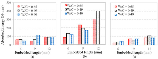 Figure 12 also shows that the longer embedment length of fiber significantly improves the absorbed energy, whereas the W/C of mortar matrix has less effect. This difference may be due to the fact that: (1) longer embedment length of fiber increases the area of pull-out load–slip curve, which need more energy for the fiber fully pulled out; (2) mortar matrix providing the primary chemical bond for the fiber–mortar interface, while it has less effect on the frictional bond of the interface. Therefore, it can be concluded that fiber embedment length has a greater effect on the absorbed energy than the mortar strength in the pull-out test.