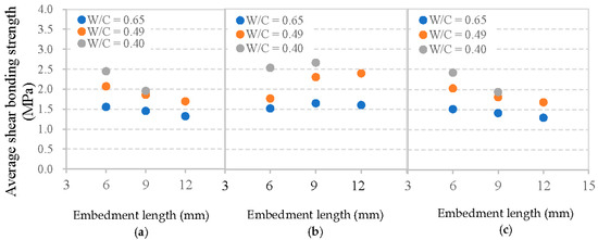Figure 13 illustrates the influences of mortar strength and fiber embedment length on the average shear bonding strength of the interface. It is shown that, at a given embedment length, all fibers possess a higher τsa with a decreasing W/C of the mortar matrix. For the basalt fiber with embedment length equals to 6 mm, when the W/C of the mortar matrix decreased from 0.65 to 0.49 or from 0.65 to 0.40, there was an increase of around 28% and 37% in τsa, respectively. The corresponding increase for PVA fiber was 39% at 0.49 WC and 61% at 0.40 W/C. For glass fiber, it was 28% at 0.49 and 35% at 0.40 with both W/C values of mortar matrix decreased from their starting point of 0.65. This is consistent with the results of [30], and can be explained since higher strength of mortar matrix with a lower W/C value improves the interfacial bonding properties.