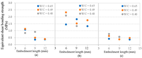 In addition, the relation between fiber embedment length, mortar matrix strength and equivalent shear bonding strength τse for each type of fiber is depicted in Figure 14. Clearly, basalt fiber presents a markedly lower τse value than PVA fiber, but a higher of that than glass fiber. This higher τse value also can be explained by the highest amount of hydration products between PVA fibers and mortar matrix, followed by basalt fibers, and then glass fibers [24]. The effects of fiber embedment length and the W/C ratio of mortar matrix on the value of τse are also significant even though no rule can be observed. However, test values are different when using steel fibers, which exhibit a typical growth with increasing concrete compressive strength in the study of [30].