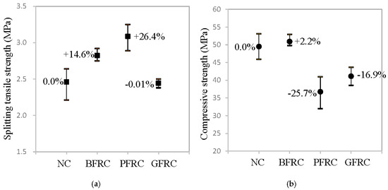 Test results of concrete specimens: (a) splitting tensile strength; and (b) compressive strength.