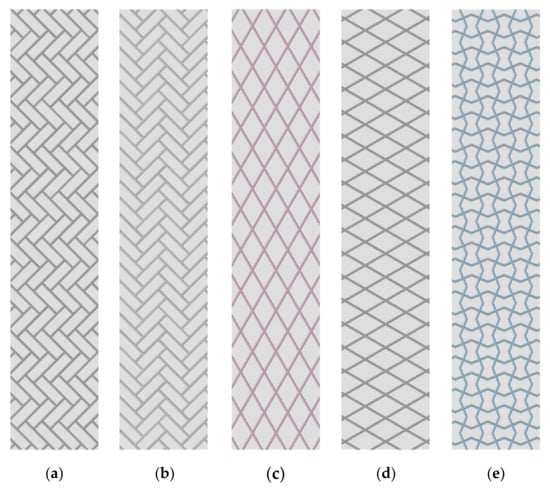 Pattern-embedded specimens: (a) Pattern A aligned with the major axis; (b) Pattern A aligned with the minor axis; (c) Pattern B aligned with the major axis; (d) Pattern B aligned with the minor axis; and (e) Pattern C.