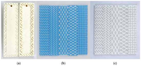 The designed specimens were 3D printed, molded, and subjected to tensile tests. The Agilus (box) and VeroCyan (pattern) were printed simultaneously by the Objet500 connex3 (Stratasys, Ltd., Eden Prairie, MN, USA). The print direction was perpendicular to the tensile direction, and all specimens were produced in the same direction. Five Agilus–VeroCyan specimens were printed for each pattern. The Ultimaker3 printed the TPU 95A pattern for the Dragonskin 30–TPU 95A specimen. The mold was designed to center the pattern in the Dragonskin 30 silicone molding. The Ultimaker 3 printed all the pattern molds with polylactic acid, as shown in Figure 5. The two components comprising the Dragonskin 30 raw materials were placed in a syringe, and air bubbles were removed using the vacuum chamber. After placing the pattern on the mold and sealing it, it was filled with the Dragonskin 30 silicone using a two-component gun and cured for one day at room temperature. Five Dragonskin 30–TPU 95A specimens were also produced using the same procedure. The produced Agilus–VeroCyan and Dragonskin 30–TPU 95A specimens are shown in Figure 5.