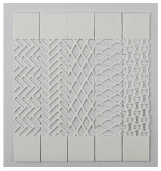 For examining the effect of patterning, the pattern was printed on the TPU 95A, and a tensile test was performed. Five TPU 95A-patterned specimens were printed for each of the five patterns evaluated in this study and with two thicknesses (0.7 mm and 1.4 mm) using the Ultimaker3 (Figure 6). The tensile testing was performed using the ST-1001 testing machine, which pulled each specimen at 50 mm/s, yielding a stress-strain curve for each specimen type.