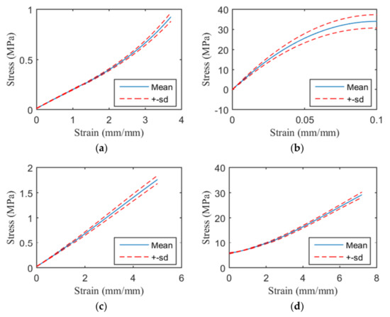 Stress-strain curves of the base materials. Mean stress-strain curves before yield for the: (a) Agilus; (b) VeroCyan; (c) Dragonskin 30; and (d) TPU 95A.