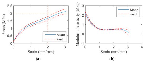Stress-strain curve and modulus of elasticity of the Pattern C Dragonskin 30–TPU 95A specimens with a 1.4 mm pattern diameter: (a) stress-strain curve before yield and (b) modulus of elasticity.