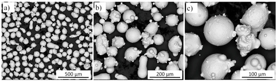 In the present study, two different laser metal deposition systems were used to fabricate components comprising an Inconel 625 alloy. A gas atomized powder (delivered by LPW Technology, Runcorn, UK) with particle sizes in the range of 45–106 μm (Figure 1a) and chemical composition presented in Table 1 was used. The shape of Inconel 625 powder particles was mostly spherical with microsatellites attached to them (Figure 1b). However, several elongated (Figure 1b) and with irregularly shaped (Figure 1c) particles were also observed.