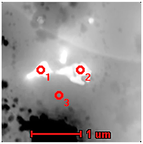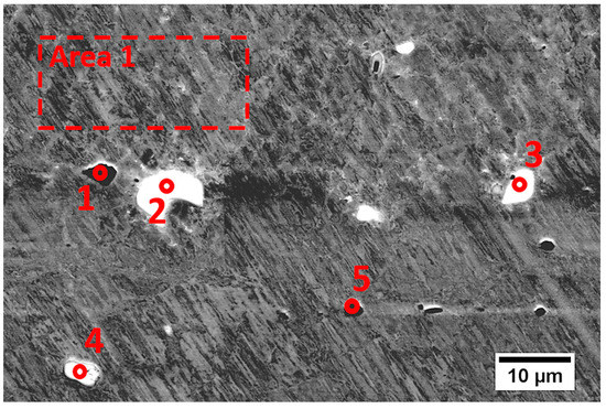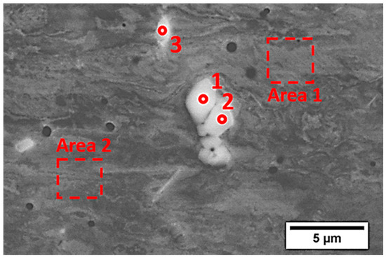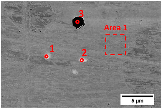 A scanning electron microscopy (SEM) micrograph in BSE mode of the material deposited using a high-power CO2 laser is presented in Figure 5. Similar to other studies [2,4,5,7], fine submicron particles were frequently observed in the deposited material. Considering the size of the observed precipitates, their quantitative chemical analysis might be complicated due to the XRD signal originating from the matrix material. The chemical composition of the fabricated material (Table 2) was similar to that of the delivered powder material, except for elements such as iron and aluminum, which had a lower content. Particles marked in Figure 5 as 1 and 2 showed more Nb, Mo, Ti, and C (Table 3), which most likely indicated the presence of MC carbides, as previously observed in an additively manufactured Inconel 625 alloy [2,4,7]. The precipitate marked as point 3 had an increased amount of Ni, Nb, Cr, and Mo without the presence of carbon (Table 3), suggesting the presence of intermetallic phases, similar to the case in Figure 2 and Table 2. Unfortunately, the quantitative analysis may have been altered by the XRD signal coming from elements contained in the matrix.
