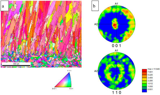 Figure 9 shows inverse pole figure (IPF) maps and calculated {100} and {110} pole figures from the deposited layer that were rotated to represent the deposition surface. One can see that the grains had a rather weak texture that was less developed than in the case for the high-power CO2 laser deposition method shown in Figure 4. Moreover, the grains were finer than in the case of the CO2 laser deposition method, and they were rotated by changing the layer cladding. This most likely occurred due to the lower power of the laser used in the experiment and smaller melt pool areas. This method also caused the formation of a different type of texture close to the {011} <100> Goss component, as observed in [14]. Moreover, from the grain boundary misorientation distribution angles, one can see that there were fewer HAGBs (66.9%) and more LAGBs (33.1%) than in the case of a higher-power laser due to the different heat flow conditions. The substrate also showed a larger number of low-angle grain boundaries (32.6%) since, at lower processing temperatures, they were not consumed by HAGBs (67.4%). The calculated average size of elongated grown crystallites was 95 μm, but the length of the crystals was smaller than in the case shown in Figure 4 and rotated from one to the other layer. A similar type of structure was observed in the case of Inconel 625 in [14], where the Goss component was observed.