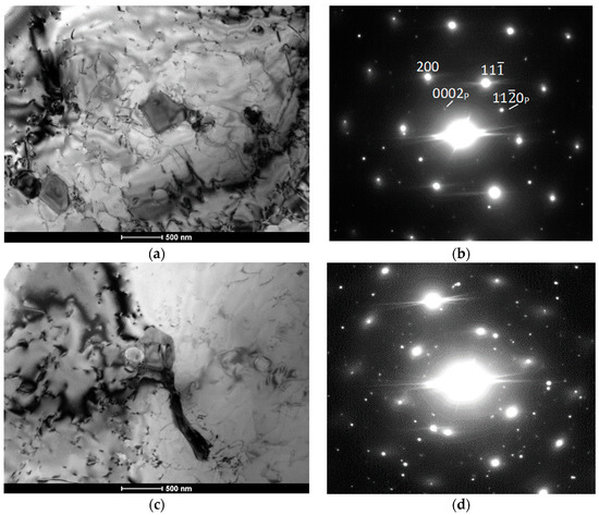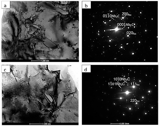 To identify the structure of the precipitates and density of the dislocations, TEM studies were performed. Figure 6 shows TEM micrographs and the corresponding SADP from the melt pool region of the high-power CO2 laser-deposited Inconel 625 alloy. In agreement with the SEM observations, fine elongated particles of size 200–600 μm can be seen in Figure 6a,c. They show slightly darker or brighter contrast depending on orientation and well-defined boundaries due to noncoherent interfaces. Electron diffraction allowed the matrix to be identified as a γ-Ni disordered solid solution, while the particles could be identified as hexagonal Nb2C with a zone axis of [20] in Figure 6b and [11] in Figure 6d. Nb2C carbides have not yet been identified in additively manufactured Inconel 625 alloys. However, their shape, which is different from that of intermetallic phases observed in regularly manufactured Inconel 625, and the results of EDS microanalysis indicate that these carbides may form under certain cooling conditions. A low dislocation density characterizes the high-power CO2 laser deposition method, where low stresses were observed compared to those from the EBAM method, where an increased volume crystallization was also observed by Ma et al. [14]. It was shown that the residual stresses can be significantly minimized by reducing the layer thickness during additive manufacturing of various Inconel-type alloys.