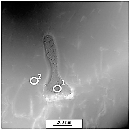 Figure 12 shows a STEM micrograph where two different particles with a size near 0.5 μm can be seen. The results of the EDS analysis shown in Table 6 suggested the presence of two types of particles. The first one had a rather rectangular shape and a high a Nb content with Mo and Cr and no carbon, which suggested an intermetallic phase. The second particle with a round shape contained some carbon and a high percentage of Nb, Cr, Ni, and Mo. These results suggest the presence of either an intermetallic or a carbide phase.