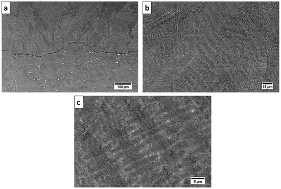 The microstructure of the Inconel 625 deposited using the LENS technique is presented in Figure 8a–c, which show SEM micrographs taken near the interface between the substrate and deposited material. An elongated cell-like structure with bright particles in the interdendritic areas can be seen. A bright contrast from the precipitates indicated that heavy elements gathered there.