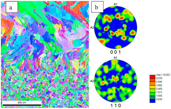 The electron backscatter diffraction (EBSD) results for samples fabricated using high-power CO2 laser: (a) inverse pole figure (IPF) maps for the substrate and the deposited material and (b) 001 and 111 pole figures rotated to represent the deposition surface; the color scale bar represents the intensity of the texture.