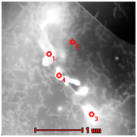 The next STEM micrograph (Figure 13) also shows various types of particles of rectangular or rounded shapes. The rounded irregularly shaped particles contained more carbon (Table 7), suggesting that they may be carbides, while those with orthogonal shapes did not contain carbon and indicated the likely presence of intermetallic phases. A higher than expected content of Ni may have resulted from the signal from the matrix in the case of small particles. Next, the TEM micrograph showed elongated particles, giving several diffraction patterns from a particle. One of them could be clearly identified as NbC with an [011] zone axis orientation, as also observed in previous works on AM Inconel 625 alloy [7,15,17].