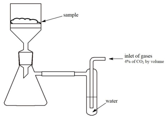 All chemicals used during analysis were purchased from Avantor Performance Materials, Gliwice, Poland S.A.: pure calcium hydroxide, pure calcium carbonate, hydrochloric acid (1 mol·L−1), sodium hydroxide (4 mol·L−1), EDTA (0.05 mol·L−1), phenolphthalein, methyl orange, Patton and Reeder’s indicator. Analyzed soda lime samples came from the company producing carbon dioxide absorbents. The first sample was a fresh, unused sample, while the second one was used and considered exhausted prior to the research. The samples were marked as follows:
