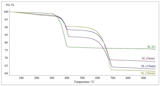 TG curves of decomposition of SL (F) sample and samples after carbon dioxide absorption: SL (5 min), SL (15 min) and SL (30 min) in nitrogen.