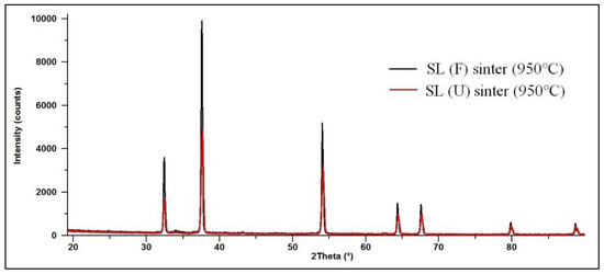 X-ray powder diffraction patterns of analyzed SL (F) and SL (U) sinters prepared at 950 °C.