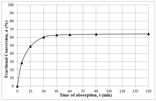 Figure 6 shows the experimental results of CO2 sorption on soda lime as a relationship between conversion rate α and time t. It clearly indicates that the conversion of the sorbent was incomplete and would be difficult to reach under the typical working conditions. According to the results shown in the figure, about 20–30 min from the beginning of the experiment, the carbonation rate slowed down noticeably. We can observe that the curve is composed of two sections. The initial upslope of the curve depicts the fastest rate of carbonation; its initial rate was 3.3 min−1. After 30 min, the reaction slowed down and reached a rate of 0.17 min−1. It was a result of significant limitations of CO2 transport from the surface to the bulk of the sorbent particles, and differentiation between kinetics-controlled and diffusion-controlled ranges occurs.