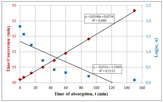 The fittings of the experimental data to the linear form of the two kinetic models, i.e., pseudo-first order and pseudo-second order, are shown in Figure 7.