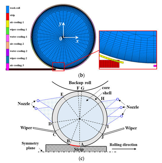 Figure 1c illustrates the thermal boundary conditions along the circumferential direction of the work roll during one revolution. Regions A~B involve high heat flow between the work roll and hot strip; regions B~C, E~H and J~A involve natural air cooling without the strip radiation at the entrance and exit, as well as the heat exchange between the work roll and backup roll; regions C~D and I~J involve wiper cooling; regions D~E and H~I involve water spraying cooling. Recently, the heat transfer analysis between a work roll and surrounding objects was generally conducted by using the APDL script language or the film/flux subroutines, which were often confidential [20,21,26,27,34,35]. In order to solve this problem, in this paper, a heat transfer model was performed based on the near contact method using a meshed, rigid body near the roll surface to predict roll temperature and the thermal stress evolution during hot strip rolling. In the simulation of thermal stress analysis without a hot strip, shown in Figure 1a, the heat transfer type meshed, rigid body layer with a larger radius was established surrounding the deformable work roll, and then the different temperatures were defined for the meshed, rigid body in different regions. The heat transfer coefficients depending on the different regions were defined as a function of the distance between the work roll surface and the meshed rigid body. The thermal boundary conditions along the circumferential direction of the work roll during rolling can be achieved by setting a specified rotating speed for the meshed, rigid body layer. In the simulation of thermo-mechanical stress analysis with hot strip shown in Figure 1b, the elements of the meshed, rigid body in regions A~B were removed and the meshed hot strip was established to realize the heat transfer and mechanical action between the work roll and hot strip.