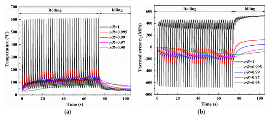 Compared with the temperatures in the work roll during rolling, as shown in Figure 3a, a similar variation trend is observed in thermal stress which shows a great temperature amplitude in the roll surface of r/R = 1 but very small temperature amplitudes in the roll subsurface of r/R = 0.995, 0.99, 0.97 and 0.95. After several early revolutions, a stable maximum compressive stress of −681 MPa and a stable maximum tensile stress of 460 MPa that are achieved at the roll surface correspond to the stable temperature state. The thermal stresses in the roll subsurface of r/R = 0.995, 0.99, 0.97 and 0.95, by contrast, remain in compression at all times during rolling. During the following idling, tensile stresses gradually increase depending on whether the roll surface or subsurface due to thermal shrinkage is accompanied by temperature decrease. At the end of the idling, the thermal stresses reach 530 MPa, 125 MPa, 46 MPa, −33 MPa and −77 MPa at the r/R = 1, 0.995, 0.99, 0.97 and 0.95, respectively.