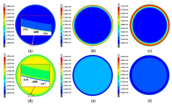 As mentioned above, another residual stress, named thermal residual stress, is inevitably produced in the work roll during the hot rolling process. Although the thermal stress has been introduced in Figure 3 and Figure 4, this stress was not equivalent to the final thermal residual stress due to a non-negligible temperature difference existing in the work roll during the hot rolling process, even at the end of idling (see Figure 5). Consequently, a longer idling time (about 100 s) was conducted to obtain a uniform temperature that is close to the ambient temperature in the work roll. In view of the thermal skin where large temperature and thermal stress gradients exist, this study focused on the temperature and the stress in the roll shell. Figure 10 shows the distributions of the temperature and the thermal stress after rolling, normal idling (30 s) and longer idling (100 s), respectively. Comparing with the temperature difference of 96 °C after rolling, the temperature difference in the roll shell gradually decreased to 34 °C after normal idling (30 s) and 10 °C after longer idling (100 s). It can be seen that the tensile residual stresses remained 15 mm beneath the roll surface, and the maximum tensile residual stress reached 535 MPa at the roll surface after longer idling.