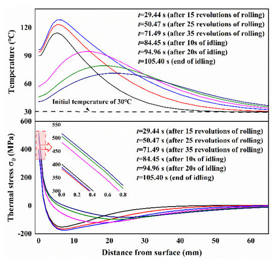 Figure 5 shows the distributions of temperature and thermal stress along the radial direction at the different instant time points. The results of temperature distribution along the radial direction indicate that the thicknesses of the thermal skin layer are localized at a depth of about 5 mm during rolling and a depth of about 15 mm during idling. Comparing the results of thermal stress during rolling, the tensile stresses at the roll surface gradually increase and the compressive stresses at the subsurface effectively decrease.