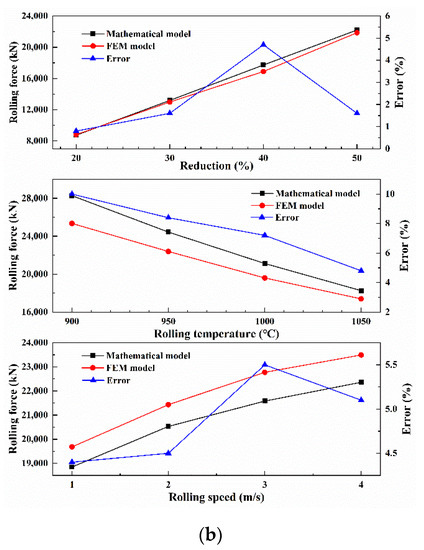 (a) Rolling force with time under different reduction, (b) comparison of rolling force between the FEM results and mathematical model results.