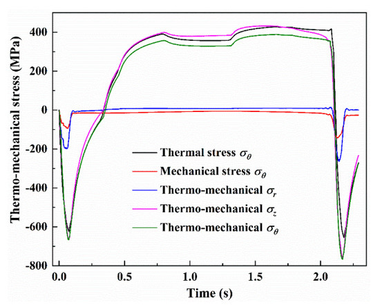 Thermo-mechanical stress components in radial, circumferential and axial directions at the roll surface comparing with thermal stress and pure mechanical stress.