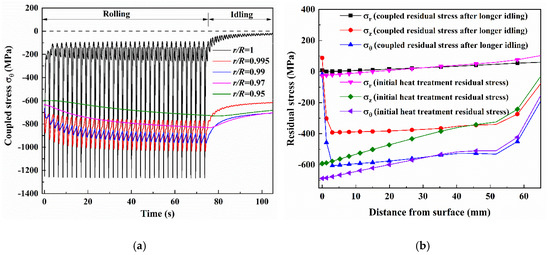 (a) Histories of the coupled stress σθ of thermal stress and heat treatment residual stress with the different depths during the whole hot rolling of one strip and the subsequent idling, (b) comparison of initial heat treatment residual stress and coupled residual stress after longer idling.