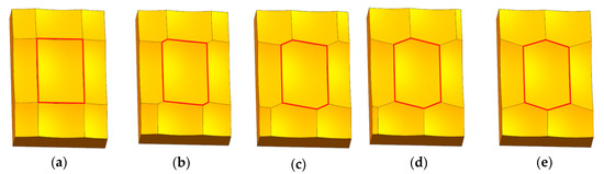 Sku is defined as the kurtosis, and Ssk is defined as the skewness [14]. It can be seen from Figure 7d that the Sku value gradually decreases with the surface topography from quadrilateral pits to axisymmetric hexagonal pits, and the surface topography was closer to the axisymmetric hexagon, the smaller the value of Sku. That is, with the topography offset distance gradually increase, the low-peak characteristics of the surface topography were becoming more and more obvious. Ssk shows oscillating change characteristics. As the offset distance increases, Sz, Sp, and Sxp gradually decrease, the change in Ssk could be caused by the change in the pit zone.