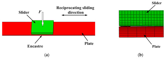 Numerical simulation model of sliding wear: (a) Sliding wear geometry model; (b) Local mesh of contact model.
