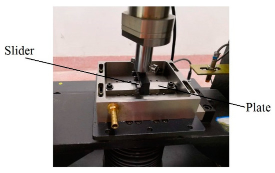 The wear test of the slider was carried out by a reciprocating sliding tribotester under dry friction conditions. The normal load in the experiment acts on the slider, and the load sensors located directly above the slider were used to feedback the normal load. In the sliding friction experiments, the single sliding distance was 30 mm, the normal load was 100 N, and the frequency was 5 Hz. The sliding friction test equipment is shown in Figure 6.