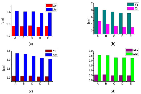 Sz is the maximum height of the topography within the evaluation area, Sp is the largest peak, and Sv is the maximum pit height. Sz, Sp, and Sv have a strong correlation with each other, that is, Sz = Sp + Sv. Sxp is the peak extreme height, and it is the height difference between the areal material ratio values 2.5% and 50%. It can be seen from Figure 7b,c that with the offset distance increases, Sz, Sp, and Sxp gradually decrease, while Sv show an oscillating changes characteristic similar to Sa.