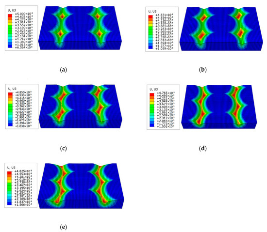 According to the Hertz theory and Archard wear model, there is a certain contact zone between the slider and the plate before sliding wear begins. As the sliding distance increases, the contact area gradually becomes larger and the wear amount also gradually increases. In order to reflect the wear characteristics of surfaces topography, when the sliding distance is 750 m, the schematic diagrams of the sliders surface wear deformation with different surface topography was extracted. To describe the wear deformation characteristic more clearly, the wear deformation scale factor was set to 20 in the numerical simulation, and the wear deformation diagram of the five groups slider contact surface is shown in Figure 8.
