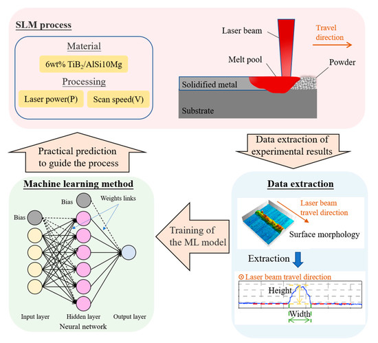 Figure 1 shows the schematic of the prediction method. Machine learning (ML) was used in this prediction method. ML trains the model with input data and uses the trained model to predict the new input data. Before the prediction process, usually there will be a testing process to check the accuracy of the trained model. Based on the ML model and the combination quantitative analysis with qualitative analysis, the parameter window of single track can be intelligently predicted.