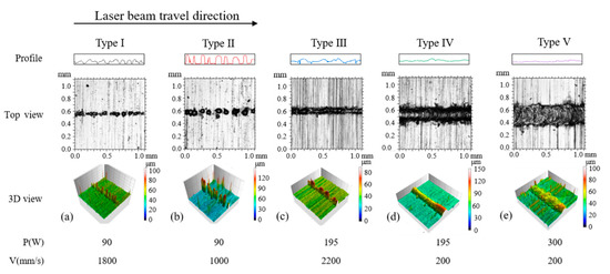In this research, we studied the effect of laser power and scan speed on the quality of the tracks by analyzing the surface morphologies and characteristics of the printed single tracks. Five types of tracks were observed as depicted in Figure 2. The top views and 3D views of the tracks were at the same enlargement factor, respectively. The outlines showing the fluctuation in laser beam travel direction also used the same vertical scale. Figure 3 is a dot distribution map to show the combinations of laser power and scan speed at which different types of tracks are formed. The experimental figures of all the parameter combinations were demonstrated in Figures S1–S6 in the supplementary file.