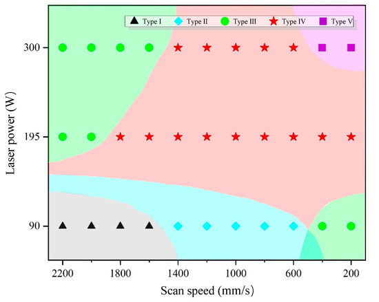 A dot distribution map showing the combinations of laser power and scan speed at which different types of tracks were formed. The base colors are for a clear distinction.