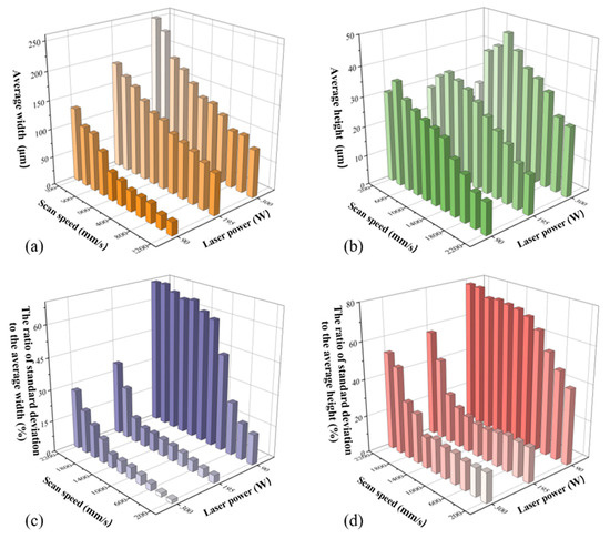 Subsequently data of the width and height of each cross-section were extracted for each track. The average and standard deviation values of both width and height were then calculated and used to obtain the ratios for each track, , , where and corresponded to the average width and height while and corresponded to the standard deviation of the width and height. The formulas for calculating the average and standard deviation values were as follows [31]: