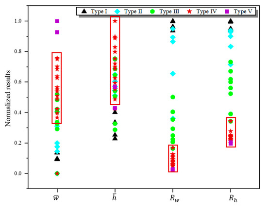The normalized results of the four evaluation indicators which are served as the input variables of the NN model. The data for each indicator were normalized with dividing each variable by its maximum value. The sets of tracks of type IV were marked with red rectangle outlines. They possessed a small and , and a relatively large and .