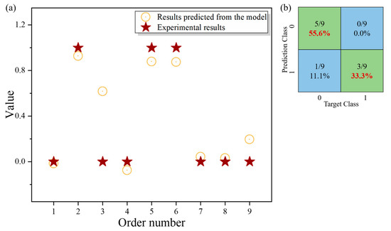 (a) The predicted results from the trained NN model and the corresponding target outputs of the nine parameter combinations (the horizontal axis shows the order of the data sets); (b) the confusion matrix showing the percentage of the correct and incorrect predictions of the prediction results.